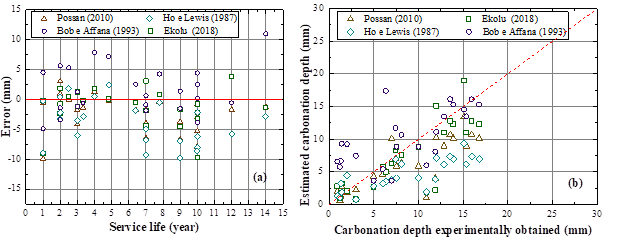 Data presented in Figure 1 (b) allows a comparison of the carbonation depths estimated by each model, relative to the real carbonation depths. The dashed red line represents equivalent results for the estimated and real values, obtained experimentally: points above the dashed line represent values that were overestimated by the model, while values under the dashed line represent underestimated estimates for carbonation depth. It can be observed that the Ho and Lewis (1987) model underestimates carbonation depths, while the Bob and Affana (1993) model overestimates them. The carbonation data estimated by Possan (2010) and Ekolu (2018) models, on the other hand, are closer to the dashed line, but still underestimate the carbonation depth.