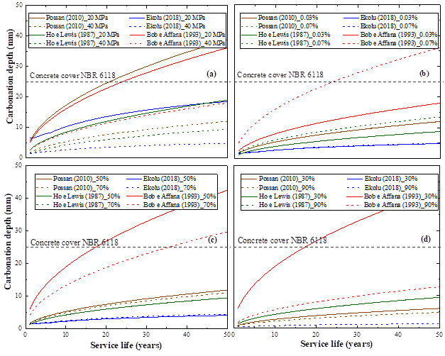 The Ho and Lewis (1987) and Bob and Affana (1993) models showed a more significant influence of the compressive strength on the carbonation depths;