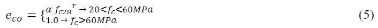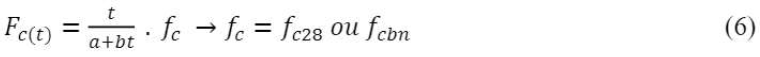 The “e co ” can be determined through (5) by inserting, if necessary, the concrete compressive strength at 28 days of curing (fc28) and the respective correction coefficients "α" and "r" from Table 3. Fc(t) is obtained through (6), and the coefficients "a" and "b" (Table 4) depend on the values of concrete strength (fc28, when considering concrete strength at 28 days and fcbn, when considering long-term concrete strength), as well as concrete ages. The “g” coefficient applied in (2) should be consulted in Table 5.