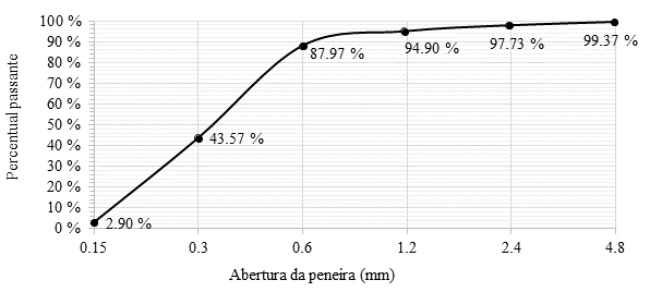 El cemento utilizado en el estudio fue el cemento Portland tipo CP ll-F-40, con uso de filler y sin adiciones puzolánicas. La arena utilizada en este estudio fue arena de cuarzo extraída de los ríos. La masa unitaria obtenida de la arena fue de 1,592.16 kg/m3 y la masa específica de 2,427.36 kg/m3. La granulometría de arena, que se muestra en la Figura 1, se obtuvo mediante ensayos según NBR NM 248 (ABNT, 2003). Como solución química se utilizó silicato de sodio neutro, en estado líquido, compuesto de fórmula Na2SiO3, por su alta compatibilidad con matrices cementicias, las cuales se diluyen al 50% en agua desionizada, razón por la cual la relación agua / cemento de esta mezcla es la mitad de las anteriores.