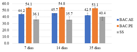 Analizando comparativamente los vacíos de las tres muestras, se puede observar que las dos mezclas que contienen AE y PE tuvieron valores mucho más altos, ya que incluso después de la impregnación con solución bacteriana permaneció la estructura porosa del PE, lo que resultó en la identificación de vacíos. En la mezcla SS, con mayor compacidad, se observó un índice mucho menor. Al respecto, cabe mencionar que no se percibe daño en la incorporación de SS directamente a la matriz.