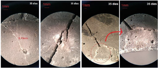 Al comparar con la bibliografía, se ve que Zhang et al. (2017), recuperaron grietas de hasta 0.79 mm a los 28 días de curado, y esta diferencia probablemente se observó porque los autores utilizaron otro material regenerador, específicamente, la bacteria Bacillus cohnii encapsulada en perlita y recubierta con geopolímero. Asimismo, Jiang et al. (2020), al estudiar la encapsulación de B. cohnii en perlita expandida, lograron sellar grietas de hasta 0.4mm, valor muy cercano a los encontrados en el presente trabajo. Liu et al (2021) informan una cicatrización de 0.25 mm.