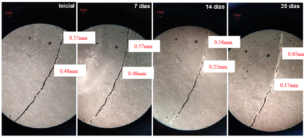 Hubo cicatrización en varios puntos a lo largo de la fisura, siendo el ancho de fisura completamente sellado más grande de 0.57 mm. Se notó el carácter progresivo de la cicatrización, siendo la hendidura inicial de 0.48 mm con solo 0.17 mm en la edad final, de acuerdo con Zhang et al. (2017). Otra observación que se puede hacer es que la distribución del producto no fue uniforme en la fisura, lo que puede resultar de la disponibilidad de perlita en el sitio para la liberación del producto de regeneración y la consecuente formación de calcita, lo cual está en línea con el estudio realizado por Alghamri et al. (2016).