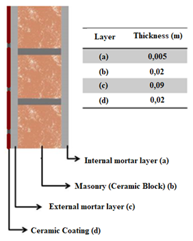 | Figure 1. Evaluated constructive system: (a) ceramic tile; (b) external mortar/plaster; (c) ceramic block; (d) internal mortar. | ||||