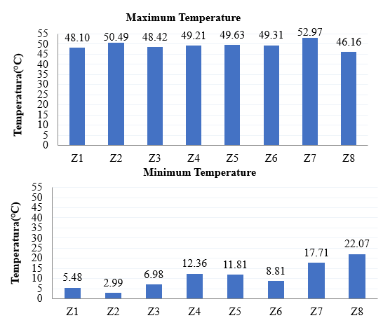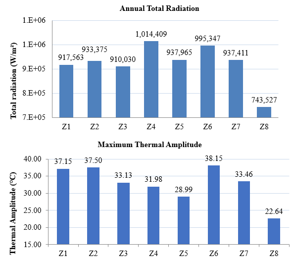 The results of the total incident radiation and the absolute maximum surface thermal amplitudes on the North facades of the eight zones are shown in Figure 2. It is noted that the highest values occur in Z6 ( 38.15°C) followed by Z2 (37.5°C) and Z1 (37.15°C), whereas the lowest value is found in Z8 (22.64°C) and intermediate values were observed in the other zones. The highest solar radiation incidence is observed in Z4 (1,014,409 W/m²) followed by Z6 (995,347 W/m²) while Z8 has the lowest value (743,527 W/m²). Additionally, the solar radiation incidence is associated with the temperature gain on each facade, especially in the Z8 and Z6 zones, except for Z4, which had the highest radiation incidence and the third lowest thermal amplitude.