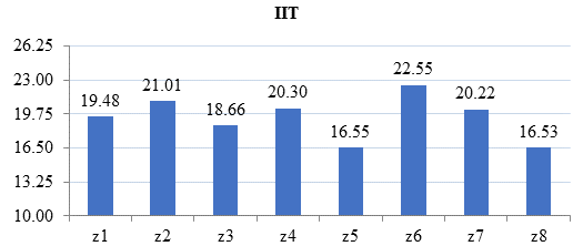 To analyze the effects associated with temperature, the weighted thermal amplitude expressed as IIT is calculated for all facades, considering the effects of cycles and surface temperature values reached in the systems (Nascimento, 2016). The ITI is established based on temperature variations and their frequency of occurrence in a given pre-established interval. To do so, the variation range of thermal amplitude is divided into four equal intervals, represented by average amplitude values. The ITI is calculated as a weighted average from the frequency values verified for the climate of Brasilia in the given time interval of one year in this study.