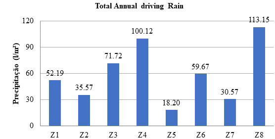 Total radiation is critical in Z4 and Z6, whereas exposure conditions are milder in Z8, despite being close to the equator and represented by Belém, in PA. This result is because the solar radiation incident on the facade is only a portion of the horizontal global solar radiation (consisting of the direct, diffuse and reflected components) (Silva, 2011) dependent, therefore, on facade orientation and slope.