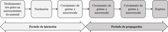 La vida útil a la fatiga (VUF) se clasifica generalmente en dos etapas: una referida a la aparición de nucleaciones en el material y otra a la propagación de grietas. En el periodo de iniciación también se observa el crecimiento microestructural de las grietas, sin embargo, en dimensiones tan insignificantes que no son consideradas en la representación o cuantificación del nivel de daño del material. A la vez, el periodo de propagación puede caracterizarse por el periodo que se refiere al desarrollo de las grietas a nivel mesoscópico. La figura 1 exhibe las diferentes fases que configuran la vida útil a la fatiga, considerando aspectos relacionados con el agrietamiento del material.