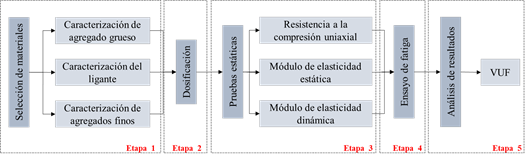 Las cinco actividades desarrolladas en el trabajo se presentan en la Figura 3 y se refieren a: i) selección y caracterización de los materiales; ii) dosificación y moldeo del hormigón; iii) ensayos para definir las propiedades mecánicas del material; iv) ensayo de fatiga por compresión; y v) análisis de los resultados obtenidos. Cada una de estas actividades se describe en detalle a continuación.