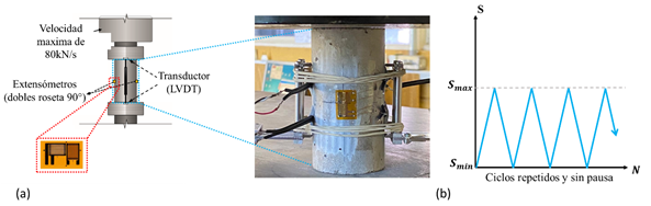| Figura 4. Esquema (a) de la instrumentación y (b) de la carga cíclica. | ||||