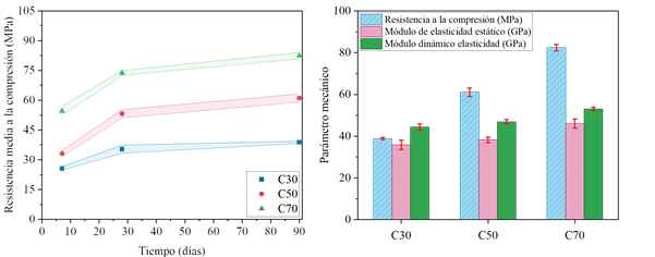 Los resultados de la caracterización de las propiedades mecánicas indican que los concretos dosificados presentan una resistencia a la compresión media, a los 28 días, adecuada a la clase de resistencia para la que fueron dosificados, siendo las resistencias medias de 35.35 MPa para la dosificación C30, 53.21 MPa para la dosificación C50 y 73.74 MPa para la dosificación C70.
