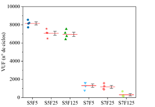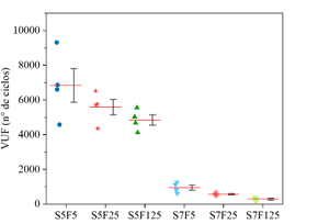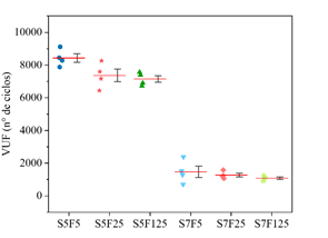Dados los diferentes escenarios de carga considerados en la campaña experimental, y considerando las propiedades mecánicas medidas y mostradas en las Figuras 5.a y 5.b, las Figuras 6-8 presentan el número de ciclos (VUF) que cada una de las cuatro muestras ensayadas, por compresión cíclica, resistió antes de suceder la ruptura. Los resultados se ordenaron para presentar el número de ciclos necesarios para provocar el fallo de cada uno de los cuatro cuerpos de prueba (VUF) y la media de los valores obtenidos en cada lote de muestreo (línea roja). En los gráficos también se representan recuadros que contienen los percentiles primero y tercero.