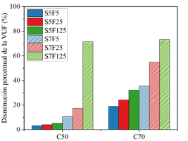 Con el fin de evaluar la influencia de la resistencia a la compresión del hormigón junto con la frecuencia de carga y el nivel de tensión máxima en la resistencia a la fatiga del material, la Figura 9 muestra un gráfico que contiene la disminución porcentual de la vida útil a la fatiga (VUF) de los concretos de lotes C50 y C70, en relación con la VUF medida en los concretos de lotes C30.