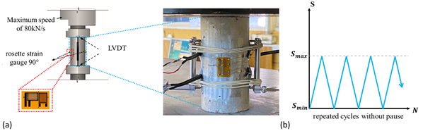 The servo-hydraulic system has an electronic control that receives analog signals from up to six different channels - load, displacement, or strain gauge. Figure 4a shows the adopted design for two rosette strain gauge and two LVDT, used in the specimens. Figure 4b shows the scheme used for the load controlled cyclic loading. Two configurations were defined for maximum load - 50% and 70% of the compressive strength (f c ), and the minimum load was always 0 kN, thus the ratio between the minimum and maximum stress R is 0.00 for both cases.