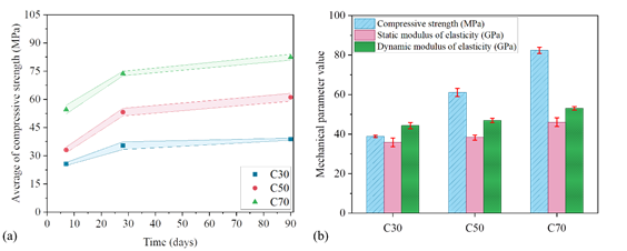 | Figure 5. Mean and deviations of (a) compressive strength at 7, 28 and 90 days, and (b) compressive strength, static and dynamic modulus of elasticity at 90 days. | ||||