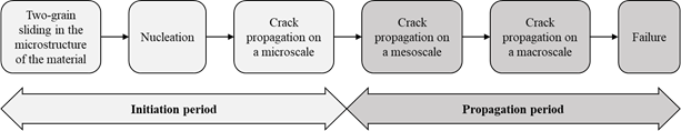 Fatigue life is usually classified into two stages: the nucleation of cracks, sometimes called initiation, and their propagation. In the nucleation period, the microstructural growth of cracks is observed but only with insignificant dimensions thus disregarded in the quantification of damage. On the other hand, the propagation period is characterized by the development of cracks at mesoscale. Figure 1 shows the phases that compose the fatigue life, considering aspects related to the material cracking.