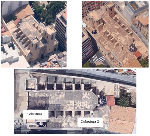 O objetivo deste trabalho é a avaliação técnica das manifestações patológicas atuais do sistema de impermeabilização da cobertura da Basílica de Santa Maria, Alicante, Espanha, Figura 1. A Basílica de Santa Maria, localizada nas coordenadas 38º20'46''N 0º28'45''W e a menos de 300 m da costa, foi catalogada como um Bem de Interesse Cultural dentro dos monumentos catalogados no Patrimônio Cultural Valenciano. As partes mais antigas do edifício foram datadas entre os séculos XIII e XIV. Do ponto de vista arquitetônico, a estrutura é de nave única sem transepto, com capelas laterais localizadas entre os contrafortes e uma abside poligonal, Fig. 2. A nave principal é coberta por seis abóbadas nervuradas com arcos pontiagudos, separadas umas das outras por arcos torais, que juntamente com as nervuras partem do capitel numa solução típica do final do século XV e das primeiras décadas do século XVI (Beviá et al, 1997).