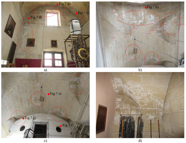 Por outro lado, se o acúmulo dos sais mencionados acima correspondesse a sais higroscópicos, estes tenderiam a reter água do ar quando a umidade relativa do ar ultrapassasse um determinado valor limite, o que poderia gerar um falso mecanismo de presença de umidade devido à higroscopia condensação, com possível aparecimento de manchas, mas causada simplesmente pela absorção de vapor d'água do ar devido ao efeito da higroscopicidade dos sais e não pela presença real de uma fonte de água por infiltração ou capilaridade. Por esse motivo, uma causa geral da patologia da umidade em edifícios históricos é o aparecimento de eflorescências devido a fenômenos de infiltração locais causados anos atrás que foram posteriormente reativados. Ou seja, o aparecimento de novas umidades na alvenaria não seria devido à presença real de uma nova infiltração de água, mas devido à higroscopicidade dos sais na superfície das rochas. Grossi e Esbert (Grossi e Esbert, 1994) apresentam uma profunda revisão bibliográfica sobre os efeitos dos sais solúveis na deterioração de rochas monumentais. Nesse sentido, no interior da igreja analisada, observam-se diferentes eflorescências e manchas, que sugerem a existência de infiltrações, Fig. 2.