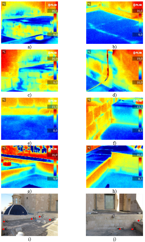 O teste foi realizado durante dois dias consecutivos. Durante o primeiro dia, foi realizada a gravação térmica dos decks 1 e 2, bem como da sala abaixo da cobertura 2. Esta gravação foi realizada entre 19h45 e 20h45. Os valores máximos e mínimos variaram ao longo do dia entre 10,7 ºC e 17,4 ºC, registrando-se um valor no momento da coleta de dados de 15 ºC externo, e 16,7 ºC, com um valor de umidade relativa entre 38-40%. Por outro lado, para os dados registrados no segundo dia, 15 de janeiro, os valores máximos e mínimos de temperatura atingiram valores entre 16,6 ºC e 8,7 ºC, registrando-se um valor externo de 13 ºC e 15,9 ºC no momento da coleta de dados, com um valor de umidade relativa entre 52%. Durante este segundo dia, foram analisadas as salas do pavimento 1, bem como o edifício anexo à sala do pavimento 2. O teste consistiu na análise dos pontos críticos detectados durante as fases de inspeção visual, a fim de corroborar os resultados experimentalmente. Em relação à superfície, foi considerado um material granular com valor de emissividade de 0,95 com base na biblioteca de materiais fornecida pelo fabricante, homogêneo para todas as superfícies analisadas. Outros exemplos publicados relacionados à emissividade deste tipo de materiais podem ser encontrados em (Barreira et al, 2021).