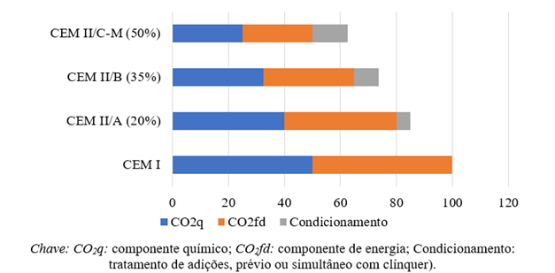 O componente químico se deve à descarbonização do calcário. Para um clínquer contendo 64% de CaO, a quantidade de CO2 no componente químico (CO2q) é de aproximadamente 500 kgCO2/t-clínquer. A quantidade de CO2 no componente de energia (CO2fd), associada ao consumo de combustível e energia elétrica, é aproximadamente igual ao de CO2q (Luukkonen et al., 2016). A nível comparativo, podemos estabelecer um valor de 100 para a emissão de CO2 associada a um cimento com 95% de clínquer (cimento do tipo CEM I na nomenclatura europeia), com uma contribuição de 50 para CO2q e 50 para CO2fd (Ver Figura 1, EMC I). No caso dos cimentos com adições minerais, cada uma das contribuições é reduzida proporcionalmente: A Fig. 1 mostra os casos do CEM II/A (com 20% de adição) e CEM II/B (com 35% de adição). Atualmente, a nível europeu, estão a trabalhar na normalização do cimento CEM II/C-M (EN 197-5, 2021), em que existe uma mistura de adições (M) até 50%, exemplo também apresentado na Fig. 1. No caso de cimentos com adições, devemos considerar que pode haver consumo de energia na sua preparação (peneiramento, moagem, secagem), seja em processos independentes ou em processos de mistura conjunta com clínquer sem moagem. É por isso que, nesses casos, existe um componente adicional que chamamos de condicionamento.