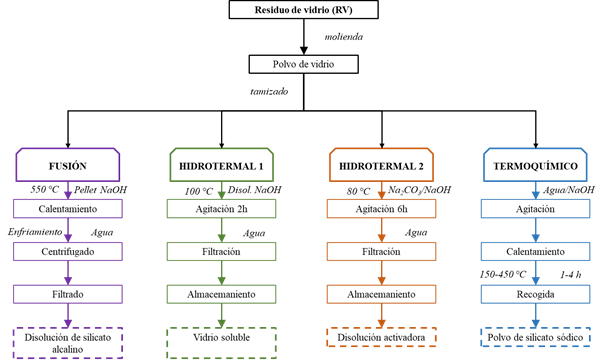 Em relação aos resíduos de vidro (RV), podem ser encontradas várias composições químicas, embora a mais notável seja o estado amorfo e um alto percentual de sílica. Desde 2014, o potencial da RV para fabricar ativadores vem sendo estudado. As porcentagens de SiO2 no RV estão principalmente na faixa de 65-80%, e teores significativos de CaO e Na2O (Liu et al., 2019). Várias abordagens têm sido feitas para a preparação do ativador alcalino, conforme mostrado na Fig. 3: método de fusão, métodos hidrotérmicos e método termoquímico. Foi demonstrado que a natureza e a velocidade de formação dos hidratos cimentícios dependem, fundamentalmente, do tipo de precursor.