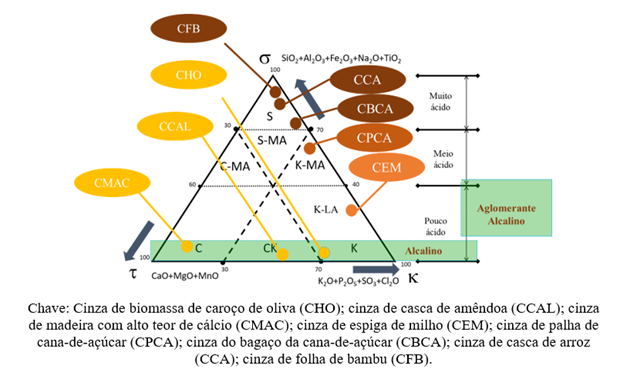 O uso de cinzas de biomassa é uma alternativa interessante para a síntese de ativadores sustentáveis. O diagrama ternário na Fig. 4 mostra uma versão expandida do diagrama de Vassilev (Vassilev et al., 2010) sobre a classificação das cinzas de biomassa, em que as zonas de reatividade foram modificadas e diferentes tipos foram representados. Pode-se observar na zona S (parte superior do diagrama) que existe um conjunto de cinzas potencialmente muito ácidas que podem fornecer uma alta porcentagem de silicatos aos ativadores alternativos: é a cinza da casca de arroz (CCA), a cinza da folha de bambu (CFB) e cinza de bagaço de cana-de-açúcar (CBCA). Numa situação intermediária (Zona K-MA) encontra-se a cinza da palha da cana-de-açúcar (CPCA), que contém outros elementos em sua composição e que reduz sua contribuição para a formação de silicatos. Por fim, dentro dos materiais de baixo teor de ácido (Zona K-LA), encontra-se a cinza de espiga de milho (CEM), que apresenta uma contribuição limitada de silício e alta proporção de potássio. Na área mais baixa do diagrama, onde estão envolvidos os óxidos mais alcalinos, basicamente CaO (extrema esquerda) e K2O (extrema direita), três zonas se destacam: zona “C”, característica de cinzas com alto teor de cálcio, como é o caso das cinzas de madeira (CMAC); a zona “K”, com alto teor de óxido de potássio, como na cinza da casca da amêndoa (CCAL); e, por fim, a zona intermediária "CK", na qual se encontra a cinza do osso da oliveira (CHO).