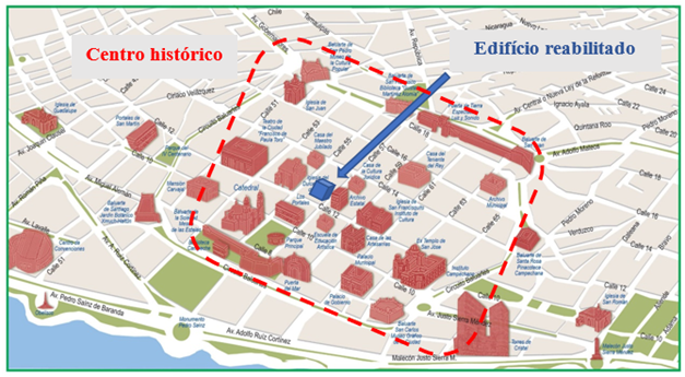 Pretendia-se a demolição e posterior construção de um novo edifício de 4 pisos, considerando que este edifício tem uma área interna de mais de 600 m2 e uma altura aproximada de 20 m. No entanto, este plano foi reconsiderado porque o edifício em questão tinha aproximadamente 70 anos e estava localizado no centro histórico da cidade de San Francisco de Campeche, Campeche, México (Fig. 1), declarado Patrimônio da Humanidade, em 1999 pela Organização das Nações Unidas para a Educação, a Ciência e a Cultura (UNESCO). Este local é protegido por autoridades federais como o Instituto Nacional de Belas Artes e Literatura (INBAL) e o Instituto Nacional de Antropologia e História (INAH). Portanto, ao invés de um processo de demolição, teve que ser considerada uma estratégia de reparo que atendesse às condições estabelecidas pelo poder público federal, onde o máximo possível da estrutura fosse preservado (80%). Por esse motivo, foi realizado um amplo estudo sobre a durabilidade do imóvel. Em consequência, foram definidas as partes que permaneceriam de pé antes de uma intervenção que envolvesse a reparação e/ou reforço dos diferentes elementos estruturais, evitando os processos iniciais de demolição e adaptando-se às condições exigidas. Foi proposta a anexação de uma nova estrutura internamente ao edifício já recuperado, mantendo assim a sua arquitetura exterior e modernizando as áreas interiores, num processo também conhecido por retrofit.