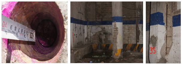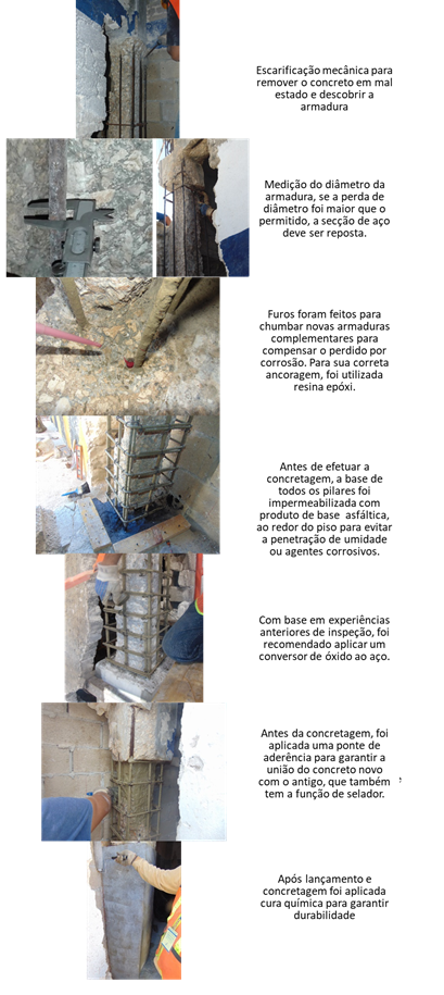 Naturalmente, o trabalho dos operários implicou em alguma ocasião o rompimento da seção de concreto ou a ultrapassagem da seção mínima exigida pelo FS. Nestes casos os cuidados incluíram não apenas escoramentos pontuais, mas também levar em consideração o monolitismo da estrutura na transferência das cargas excedentes do trecho contemplado para os elementos vizinhos.