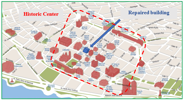 One of the common problems in concrete repairs is the misuse of structural specifications to know the depth to which they must be made, when faced with problems due to chlorides or carbonation. This results in a poorly optimized use of labor, equipment and materials that leads, not only to wrong repairs and the return of the problem, but also to a lack of sustainability in the entire process. This building with an internal space of more than 600 m2 and an approximate height of 20 m, and a frame-based structure, involved a demolition and subsequent construction of a new 4-level building. However, this plan was reconsidered because the building was approximately 70 years old and was located in the historic center of the city of San Francisco de Campeche, Campeche, Mexico (Figure 1), declared a World Heritage Site in 1999 by the United Nations Educational, Scientific and Cultural Organization (UNESCO). This place is protected by federal authorities such as the National Institute of Fine Arts and Literature (INBAL, in Spanish) and the National Institute of Anthropology and History (INAH, in Spanish). Therefore, rather than a demolition process, a repair strategy had to be considered that met the conditions established by the federal authorities, whereas much of the structure was preserved as possible (80%). For this reason, an extensive study was carried out on the durability of the property. Therefore, the parts that would remain standing prior to an intervention that would involve the repair and/or reinforcement of the different structural elements were defined, avoiding the initial demolition processes, and adapting it to the required conditions. It was proposed to attach a new internal structure to the building that has already been repaired, thus maintaining its exterior architecture, and rescuing interior areas.