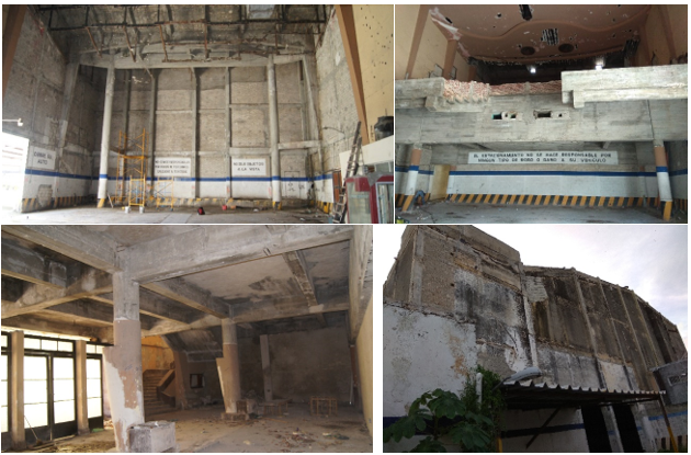 The structure had as its primary function that of being a cinema, later it functioned as a parking lot and was finally abandoned. These changes in use and abandonment were factors that potentiated the damage, as partially observed in the photos of Figure 2.
