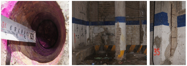 To carry out the repairs, it was necessary to establish the criteria with which they would be carried out. In the case of this structure, there were elements of different dimensions, for which universal repair criteria were established but they had to be verified before their execution. An UDR may or may not be large in relation to the size of the element. However, in this case and in order not to resort to materials, labor and time as is the case with the installation of stabilization struts, it was determined for practicality that the best thing was to carry out the repairs in sections of 1.5 linear meters. The following is an example of a rectangular type of column. The typical column (see Figure 5) had a cross section of 30x35 cm and with the help of the mechanical tests carried out it was possible to obtain the average compressive strength of the concrete, which is greater than 200 kg/cm2. Considering the cross section of the element and the minimum resistance obtained, it can be deduced that the column can support an axial load of 210,000 kg. Now, if the concrete in poor condition is scarified, and it is repaired beyond the reinforcement, remembering that the uniform deep repair is the one that occurs beyond 3 cm or behind the reinforcement, the new cross section of the element is 25x30 cm. If this new cross section is used and the compressive strength obtained previously with the extracted cylinders, it can be determined that the structure, even with the reduction in the concrete section, can support 150,000 kg. If it is considered that, at least, the element was designed with an SF of 1.5, then the structure was initially designed to carry a load of 140,000 kg safely. Therefore, even after scarifying, the item to be repaired can still withstand the loads exerted as it can resist up to 150,000 kg. This could not be entirely true since it is not an analysis that considers all the possible effects that may exist at the time of making the repairs. However, it is a good strategy to be carried out in the field since it allows a quick appreciation of how far one can intervene without structurally affecting the element and to be able to continue with the repair work once the diagnosis has been made.