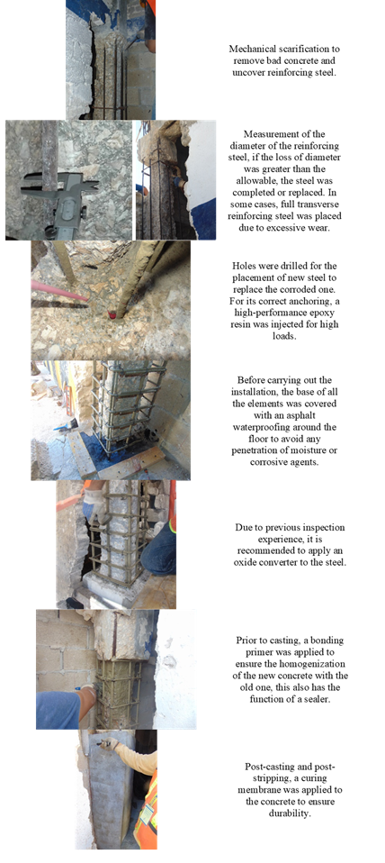 After the inspection carried out, it was found that the structural and architectural elements could be intervened for their consolidation with the new structure to be built inside the building as part of its change of use. All repair strategies were established to be able to provide the structure with a new service life and durability against current and future pathological problems to which it could be subjected, considering the mechanical characteristics of the elements themselves, as well as the use of the safety factors (NMX-C-530-ONNCCE, 2018; Val and Stewart, 2002; Melchers, 2001). These strategies were based on previous experiences and on the literature such as the Rehabilitar Manual (Helene and Pereira, 2003). The purpose of these repairs was to remove damaged concrete or that presented a pathological problem such as carbonation, as well as to ensure structural stability with the recalculation and restructuring of the amount of steel necessary in the elements, in addition to ensuring the adequate coating according to the structural requirements. Figure 3 shows processes of deterioration of the structure. To define the repair strategies, it was necessary to establish the types of repairs to be used: