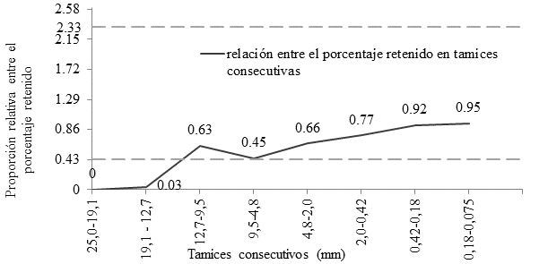 Según la figura 2, las bandas de 12,7-9,5, 9,5-4,8 y 4,8-2,0 mm tienen agregados con un tamaño de partícula superior a 1,18 mm. Además, la relación entre el porcentaje de material retenido entre tamices consecutivos varía de 0,43 a 2,33. La banda 9,5-4,8 mm tenía una relación entre el porcentaje retenido entre tamices consecutivas muy cercana al valor mínimo estimado para una buena interacción entre los agregados. Por lo tanto, esta banda no se ha considerado en la selección de DASR. Para la elección entre las bandas 12.7-9.5 y 4.8-2.0 mm se calculó la porosidad DASR que cada una proporcionaría, por medio de la Ecuación (1).