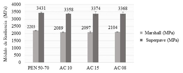 La mezcla con el ligante PEN 50-70 cumple con una resistencia a la tracción mínima de 650 kPa (conforme a la norma DNIT ES 031/2006), tanto para el método Marshall como para el Superpave. Para las mezclas asfalto caucho, la norma DNIT ES 112/2009 requiere una resistencia a la tracción mínima de 750 kPa. Este límite fue cumplido por todas las mezclas, excepto por la mezcla AC15 compactada por el método Marshall.