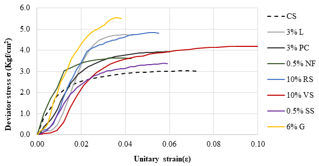 Modifications of the rupture envelope in clayey soils with different volumetric stabilizer