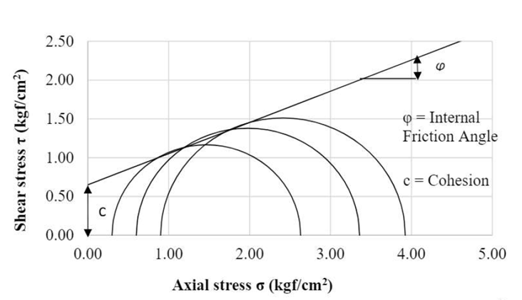 The shearing resistance was obtained by the Mohr-Coulomb failure criterion, a theory constituted in 1773 which allows to determine the cohesion (c) and the internal friction angle (().