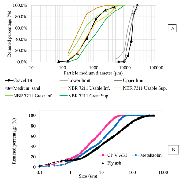| Figure 3. Particle size distribution of the aggregates (A); cement and additions (B). | ||||