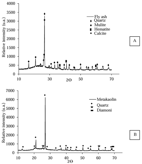 In Figure 4 (A), crystalline peaks of Quartz, Mullite, Hematite and Calcite are observed, with ou amorphous halo between 15° and 30° indicating the presence of reactive materials. In Figure 4 (B), Quartz, Bornite and Diatomite peaks were identified, with a discrete amorphous halo between 20° and 30°. Even though the MK presented a smaller amorphous halo than the FA, according to the Brazilian standard NBR 5751 (ABNT, 2015), the pozzolanic activity of MK was significantly superior to the FA. According to the NBR 12653 (ABNT, 2015), the material is considered pozzolanic when the sum of silicon, aluminum and iron oxides is superior to 70%. According to “Table 3”, the result of this sum is 89.41% to the fly ash and 95.31% to the MK. This aspect, in addition to the smaller particle size of the MK, is an explanation to the superior pozzolanic activity of the MK compared to the FA.
