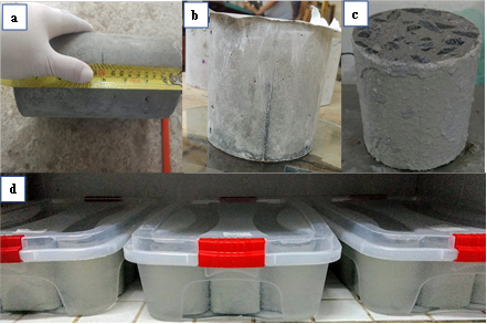 The CSs were ait in half to attend the dimension required by the standard (NT Build 443), 100 mm diameter and 100 mm height (b), and then were saturated in calcium hydroxide solution [Ca(OH)2] with 3 g/l concentration, until a stable mass was obtained. After that, the specimens were epoxi painted (c), leaving only the upper surface of the specimens free, allowing then the unidimensional chloride diffusion. After the preparation, the specimens were immersed in a sodium chloride (NaCl) solution with concentration of 2.8 M (165 g/l ±1) and temperature of 23 ± 2 °C for 90 days.