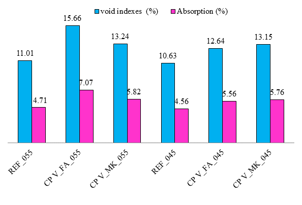 In Figure 7, average values (2 CSs) are presented for the total water absorption by immersion and the void index obtained by this same test described in NBR 9778 (ABNT, 2005). According to this standard, the void index is a relation between the volume of permeable pores and the total volume of the specimens. For that, it is expected that the higher the void index, the higher the capacity of water absorption of the sample.