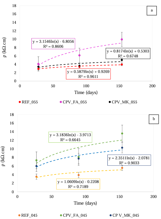 | Figure 8. Results of the electrical resistivity of the studied concretes over time: (a) mixtures with a/agl ratio 0.55 and (b) mixtures with a/agl 0.45. | ||||