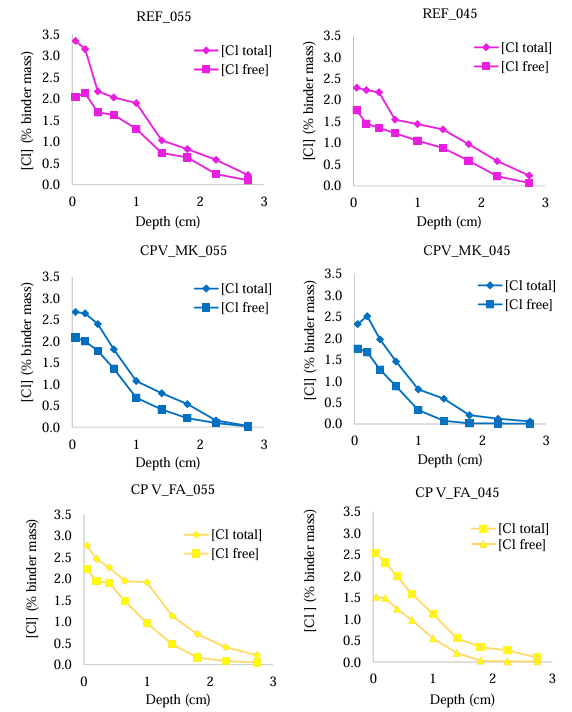 When comparing the profiles of free and total chlorides, the difference between both can be explained by the chloride binding of the cementitious matrices. According to Luping e Nilsson (1993), the chloride ions present in the cementitious matrix can be free or bound in the matrix (physical or chemically).