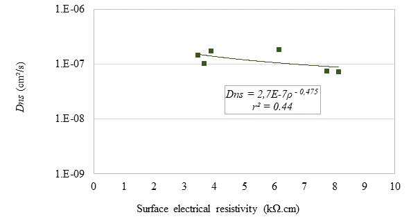Figure 10 presents the relationship between the surface electrical resistivity and the mass transport considering the different concrete mixtures of this work. This relationship can be expressed by Equation (2). According to Andrade, et al. (2014), chloride resistivity and diffusivity relations cab be obtained in a quick manner using the resistivity measurements and Equation (2), where Dns represents the apparent diffusion coefficient, K is a constant which depends on the concentration of solution used, is the apparent resistivity of the concrete and a is an exponent which depends of the chloride binding capacity of the matrix.