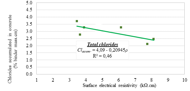 In Figure 10, the coefficient of determination is relatively low, which may be attributed to the difference between the mixtures and their binding capacities, as well as the fact that the difference among resistivities of the concretes is much lower than that presented in Figure 2. Another approach focused or the relation between chlorides transport oud resistivity is thorough relating the total accumulated chlorides in concrete and its resistivity. This can be seen in Figure 11, which shows a linear relationship between these two variables.