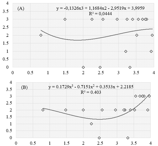 A partir da análise dos resultados é possível verificar que para a primeira verificação (Figura 2-A) a dispersão dos dados se apresenta com acurácia baixa, em que a tentativa de ajuste polinomial da curva não se mostrou adequado, apresentando o valor de r²<0,1, considerado baixo. Já no segundo caso (Figura 2-B), os resultados apresentaram melhor acurácia quando comparados com a primeira análise. No caso do ajuste da curva, o resultado apresentou comportamento medianamente satisfatório, alcançando um r²=0,4.