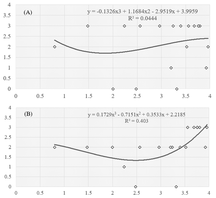 From the analysis of the results it is possible to verify that for the first verification (Figure 2-A) data dispersion is presented with accuracy low, in which the attempt of polynomial adjustment of the curve did not prove to be adequate , with a value of r²<0.1, considered low . In the second case (Figure 2-B), the results showed better accuracy when compared to the first analysis. In the case of curve fitting, the result showed moderately satisfactory behavior, achieving an r²=0.4.
