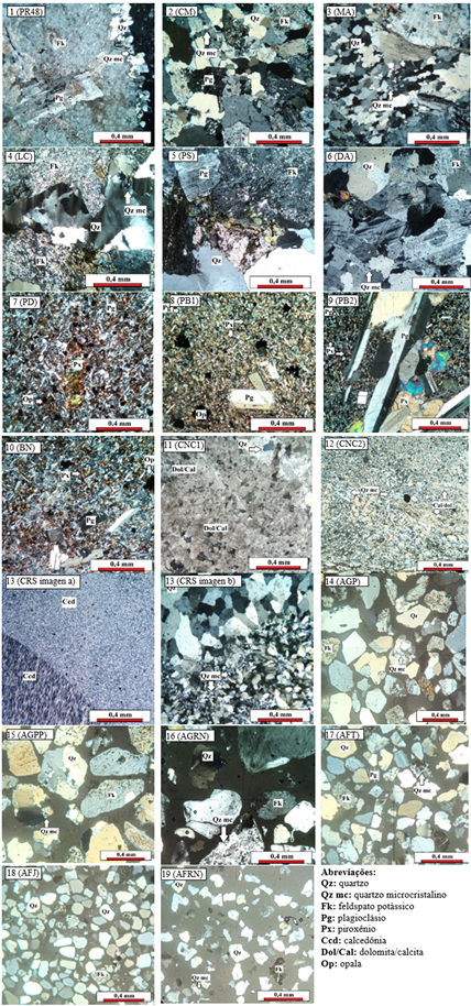 Na avaliação foram empregadas 19 amostras de agregados (13 de agregado graúdo, 3 de areia grossa e 3 de areia fina) todas consideradas aptas para concreto (UNIT, 2005) provenientes de fontes de exploração localizadas em diferentes regiões do país (Tabela 4). Além disso, a composição mineralógica e os componentes reativos são indicados conforme IRAM 1531 (IRAM, 2016) e IRAM 1512 (IRAM, 2012). As amostras numeradas de 1 a 6 eram amostras de agregado graúdo "granitos", aqueles que apresentaram quartzo microcristalino e quartzo de estresse (Qz/mc e Qz/t) como componentes reativos. Da 7 à 10 eram amostras de basalto e apresentavam vidro vulcânico alterado (Vv) como componente reativo (além disso, a amostra 10 apresentava opala). As amostras 11 e 12 eram metadolomia, a amostra 12 apresentava quartzo microcristalino (Qz/mc). A amostra 13 foi um seixo rolado silicioso com a presença de quartzo microcristalino (Qz/mc) e calcedônia como componentes reativos (Ccd). As amostras 14 a 19 são areias de depósitos fluviais com quartzo microcristalino (Qz/mc) como componente reativo. Na Figura 1 mostram-se imagens das amostras.