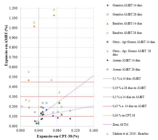 A Figura 2 plotou a expansão na metodologia AMBT aos 14 e 28 dias do ensaio vs. a expansão no CPT-38, o que nos permitiu observar a baixa correlação entre ambas as metodologias. Tanto os pontos próximos ao eixo das abcissas quanto os pontos próximos ao eixo das ordenadas apresentam resultados que se desviam da correlação. As primeiras são devidas a amostras de granito (com Qz/mc e Qz/t como componente reativo) e as últimas a amostras de basalto (com presença de Vv). Foram incluídos os resultados em basaltos relatados por Madsen e colaboradores (Madsen et al. 2018), observando-se que duas das três amostras apresentaram baixa correlação (pontos próximos ao eixo das ordenadas).