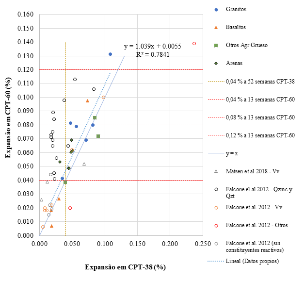 A Figura 3 apresenta a expansão do prisma de concreto, a metodologia acelerada CPT-60 vs. a expansão usando a metodologia tradicional CPT-38, incluindo todas as amostras avaliadas. Uma correlação adequada foi obtida entre ambos (R2 = 0,78). O número de amostras por tipo de agregado foi limitado, portanto não foi possível fazer uma linha de correlação para cada tipo.