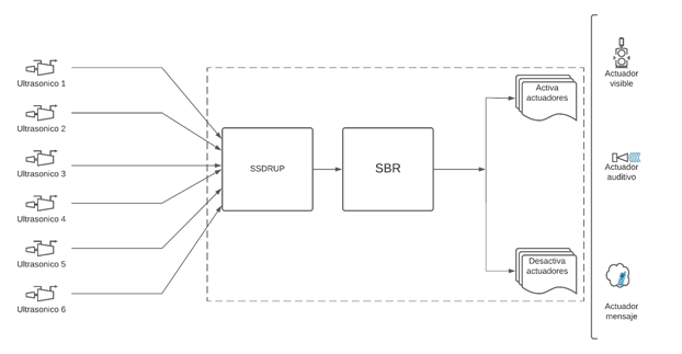 Entonces SBR para SSDRUP embebe el motor de inferencia que se encarga de realizar la evaluación de todas las medidas recolectadas por los sensores, determina la mayor de las medidas, evalúa y establece el estado de salud estructural que se determina con las reglas de inferencia, y genera los niveles de lógicos de las salidas del sistema para activar o no el funcionamiento de los actuadores previstos. Finalmente, en la Figura 4 se muestra el sistema SBR para SSDRUP completo.